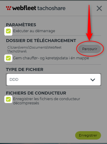 L'application de bureau "TachoShare" permet de synchroniser les fichiers tachygraphes téléchargés (Fichiers conducteurs et véhicules) via Webfleet en les copiant dans un dossier sur votre ordinateur.